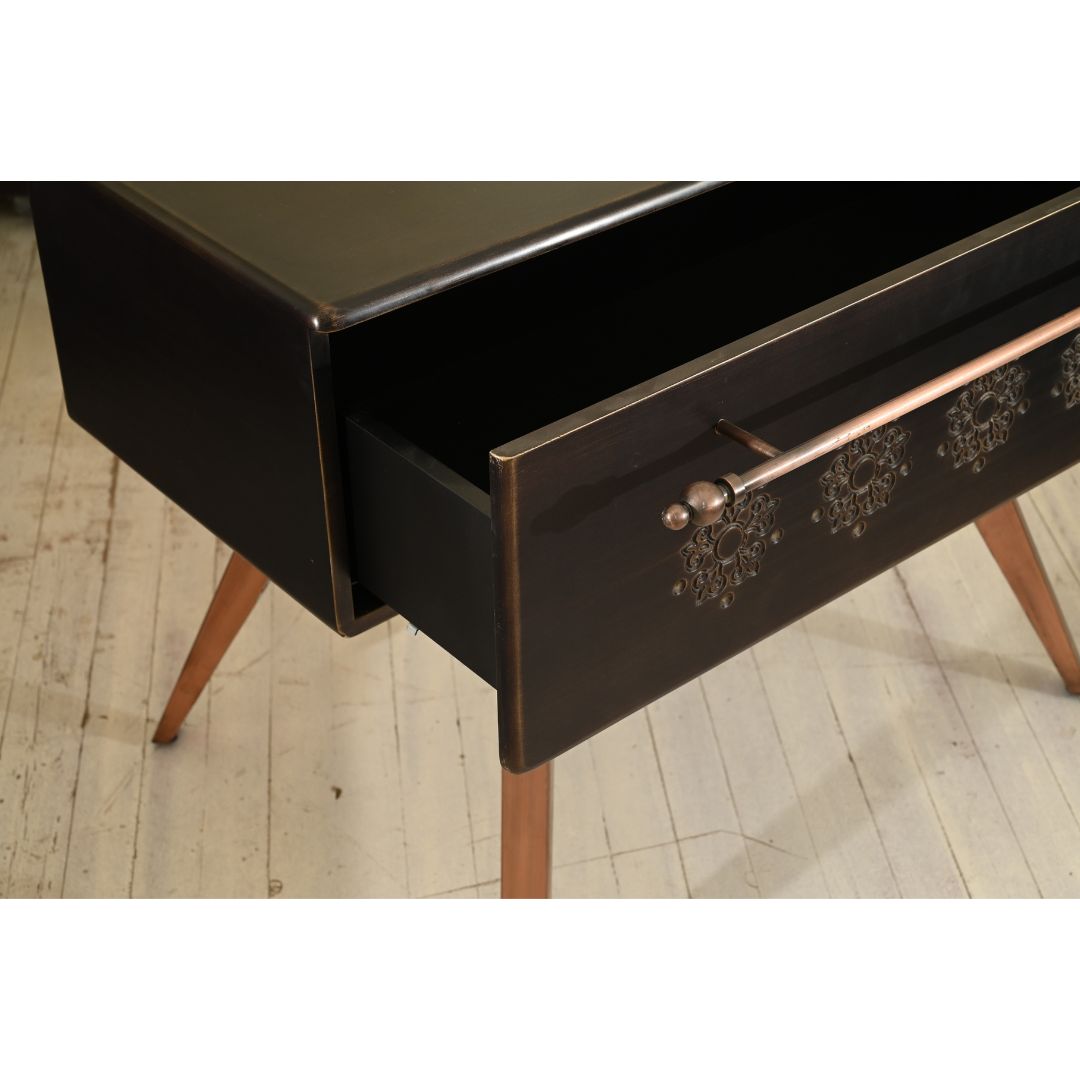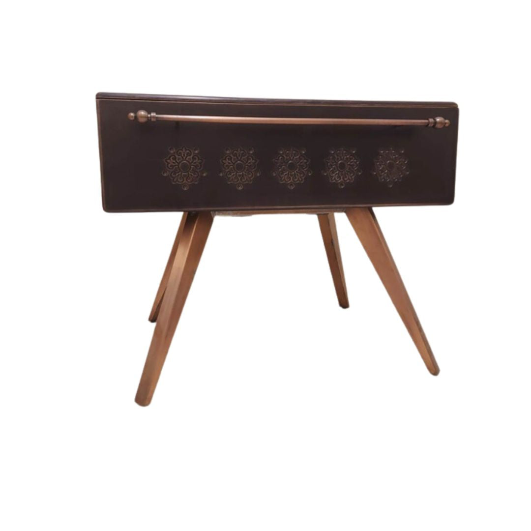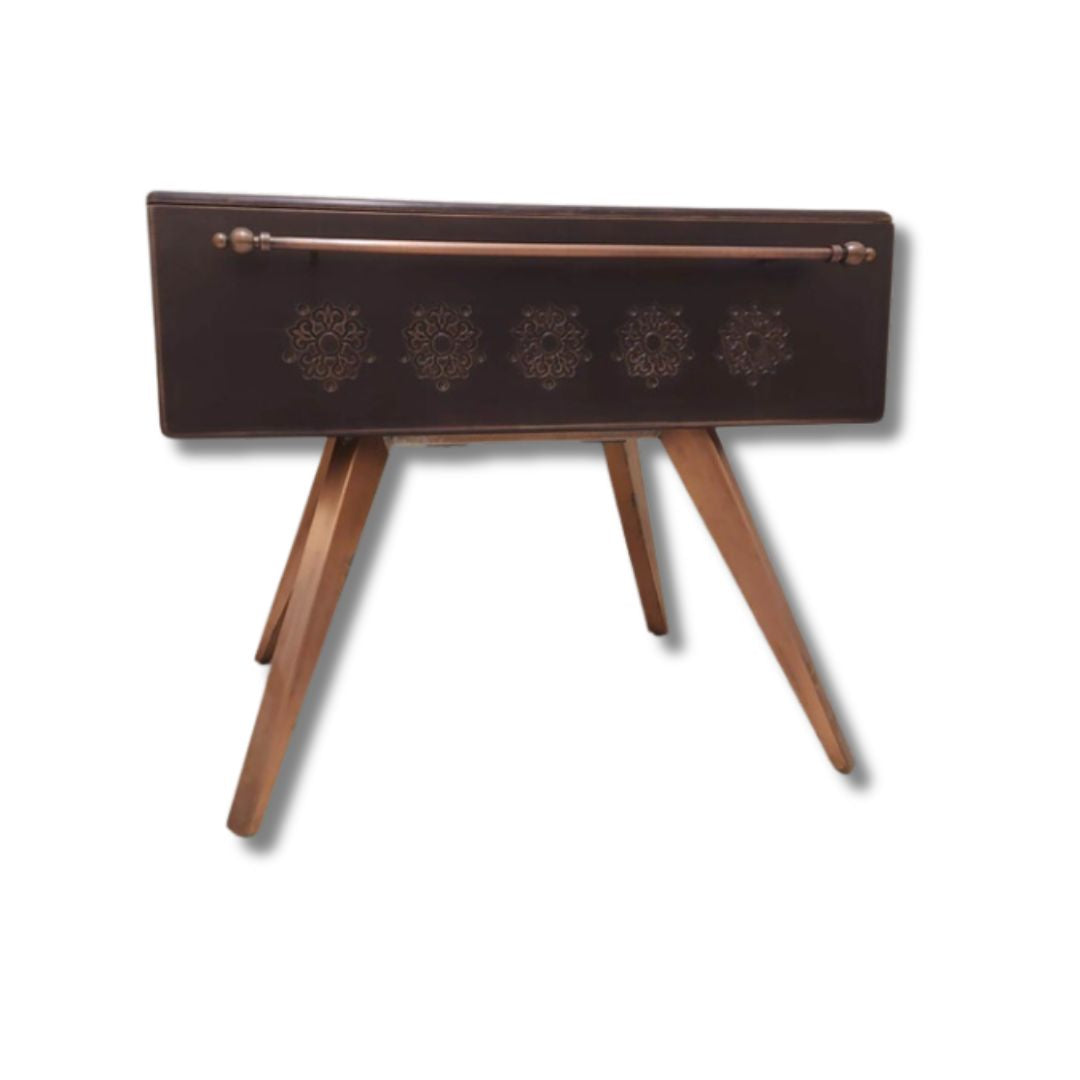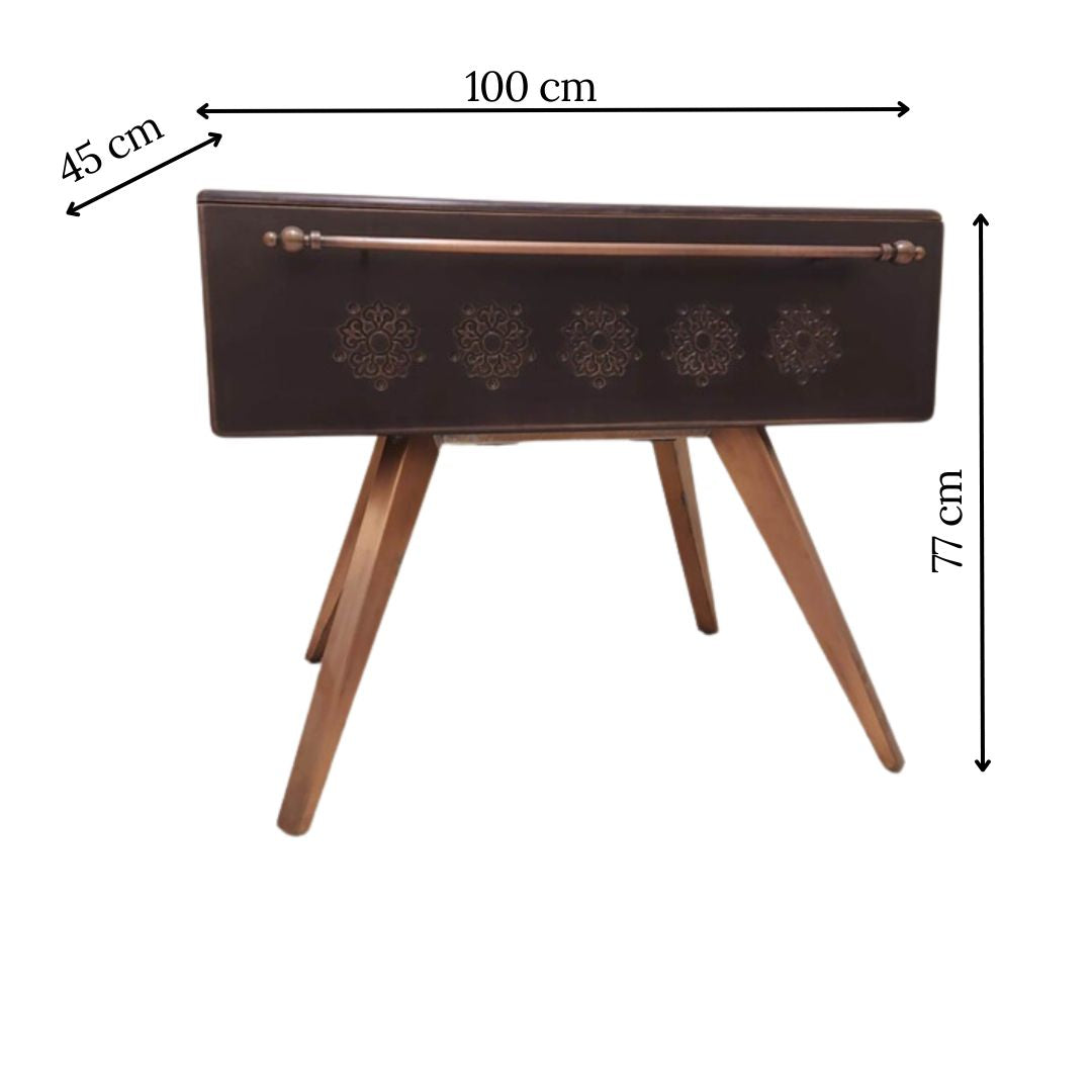 This premium console is designed with versatility and elegance, crafted to store prayer carpets and isdals in style. Featuring a unique vintage finish with authentic carvings, it embodies a blend of tradition and refinement. The copper-finished legs add a warm, luxurious touch, while the copper handle doubles as a convenient prayer carpet hanger. Ideal for any space, this piece combines functionality with timeless beauty, making it a meaningful addition to your home.